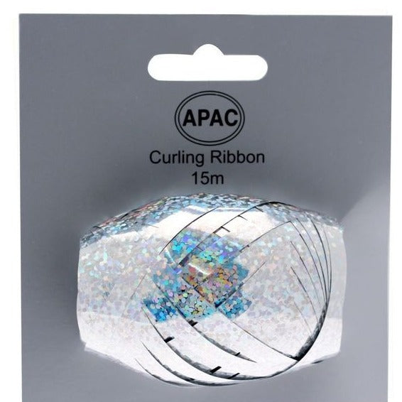 A 15m cop of Holographic Silver curling ribbon. Easy to curl, great for dressing up gifts, balloons or floral arrangements. Cut the ribbon to the length required, use a pair for scissors and run along the side of the ribbon for a perfect curl
