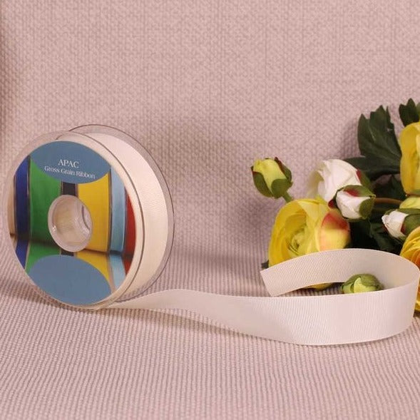 A roll of Ivory grosgrain ribbon. Grosgrain ribbon features a ribbed effect along the length of the ribbon and is perfect for gifts, promotional items and of course flower packaging. Grosgrain ribbon is easy to tie and bow.