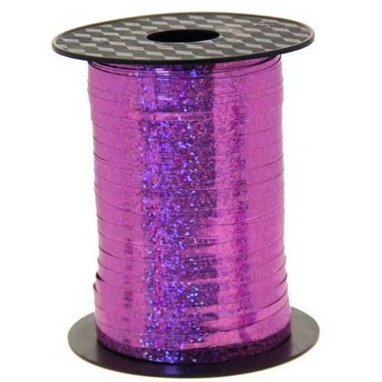 A 500m roll of Pink Holographic curling ribbon. Easy to curl, great for dressing up gifts, balloons or floral arrangements. Cut the ribbon to the length required, use a pair for scissors and run along the side of the ribbon for a perfect curl.
