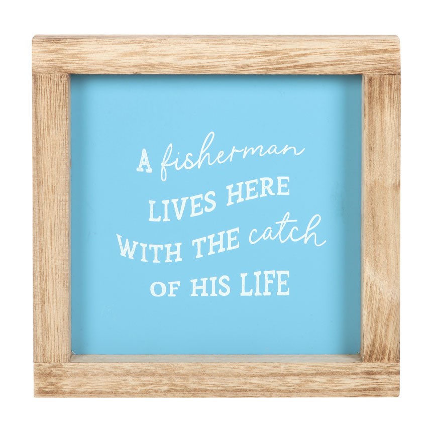 This charming wooden frame sign comes in a modern, nautical design featuring fun, 'A fisherman lives here with the catch of his life' text that's perfect for any seaside abode. Its cute message celebrates the pride of a fisherman's life and the love that makes a house a home.