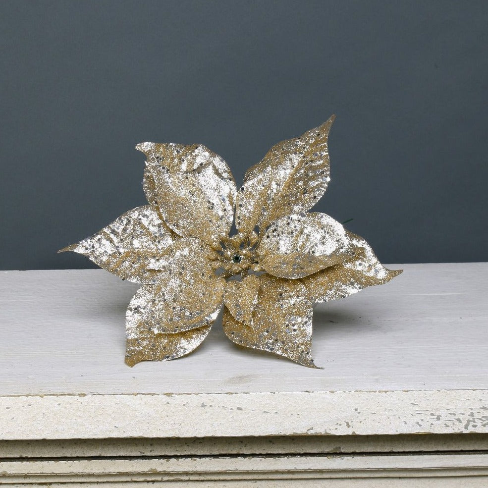 Add a festive touch to your decorations this holiday season with this artificial gold glitter poinsettia pick. This stunning accent piece is perfect for creating a stunning table centrepiece or for adding a special touch to a wreath. With its glittery gold petals, this piece will create a beautiful festive atmosphere.