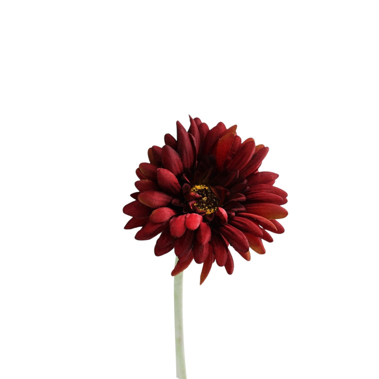 This artificial burgundy gerbera features deep, rich burgundy petals that bring bold elegance to any arrangement. With its lifelike, vibrant bloom, this flower is perfect for adding a dramatic touch to weddings, events, or home decor. Its realistic appearance and low-maintenance nature ensure lasting beauty and sophistication.