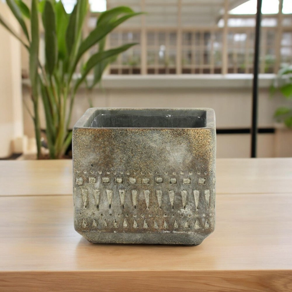 Aztec tribal pattern cube planter. Made from cement with a muted matt green and grey washed tone. Perfect to house indoor plants, this pot will blend in with any home décor and compliment your indoor greenery. There are no drainage holes, an inner plastic liner is included to ensure no leakage.