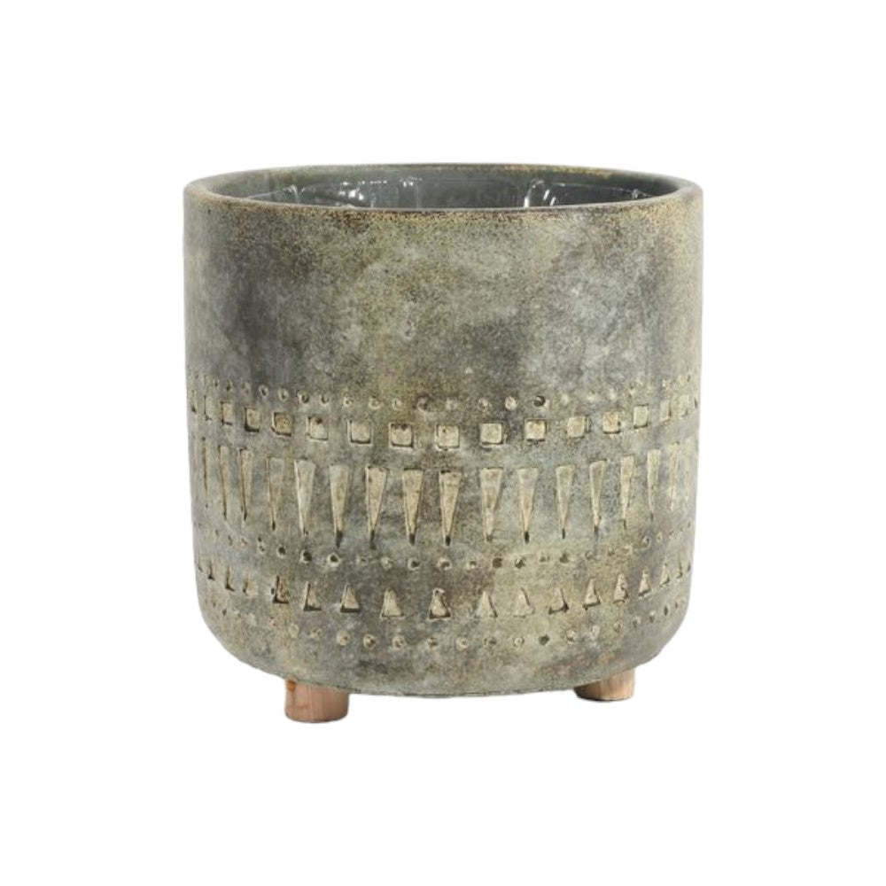 Aztec tribal pattern plant pot on feet. Made from cement with a muted matt green and grey washed tone. Perfect to house indoor plants, this pot will blend in with any home décor and compliment your indoor greenery. There are no drainage holes, an inner plastic liner is included to ensure no leakage.