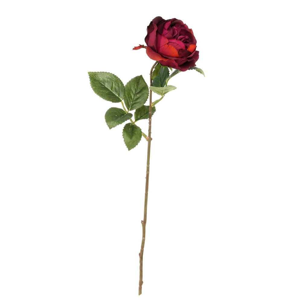 A single stem, this silk rose features one open fluffy head in deep burgundy, with complimenting foliage. These flowers will never wilt so your displays can last for years to come. Use to create floral displays all year round, perfect for the home, office or any event.
