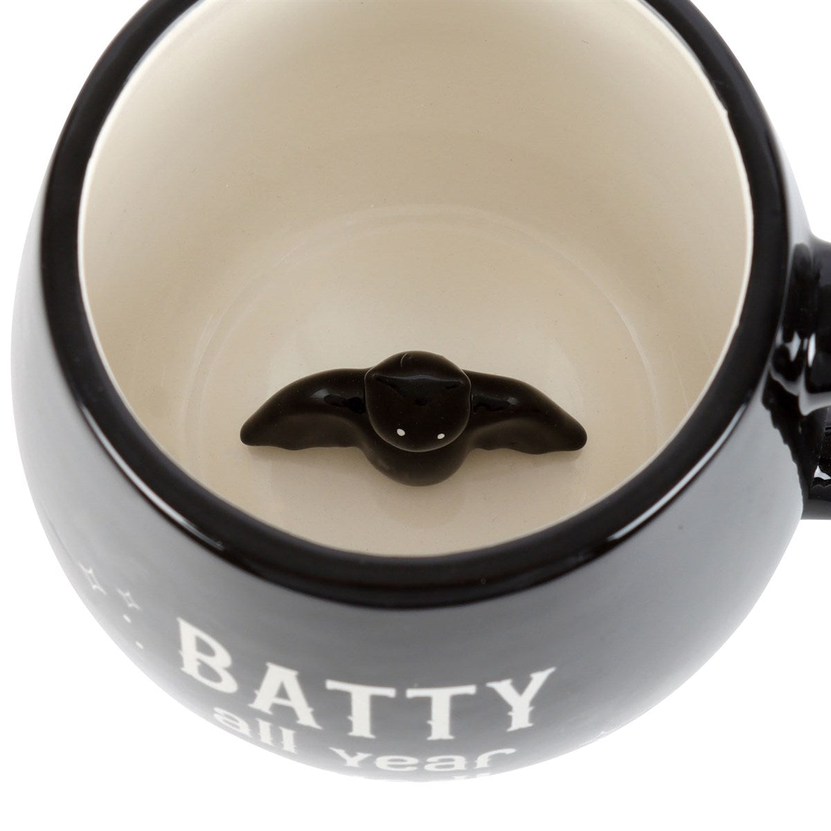 Feeling a bit batty? This fun peekaboo mug is sure to show off your dark and quirky personality with a special hidden surprise! Features 'Batty all year round' text on a black base and a charming 3D bat interior to start (or end) your day with a smirk. Great Halloween addition.