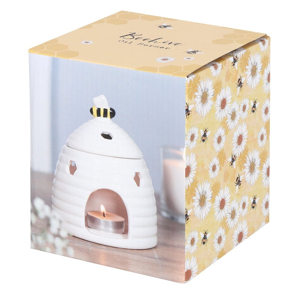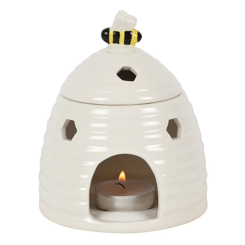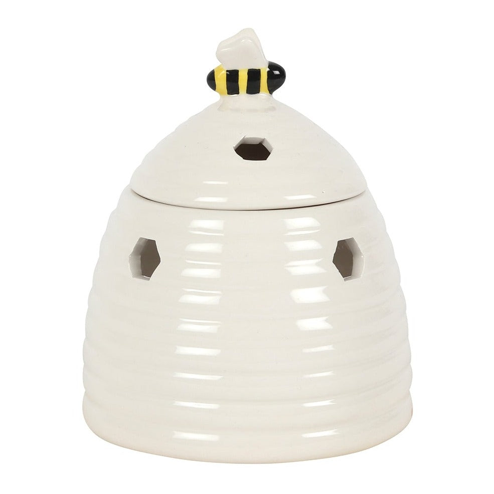This ceramic oil burner and wax warmer comes in the shape of an adorable white beehive with a sweet bee on the lid. Honeycomb-shaped cutouts finish off this unique style. Compatible with both fragrance oils and wax melts. Do not use more than one tealight and remove lid when in use.