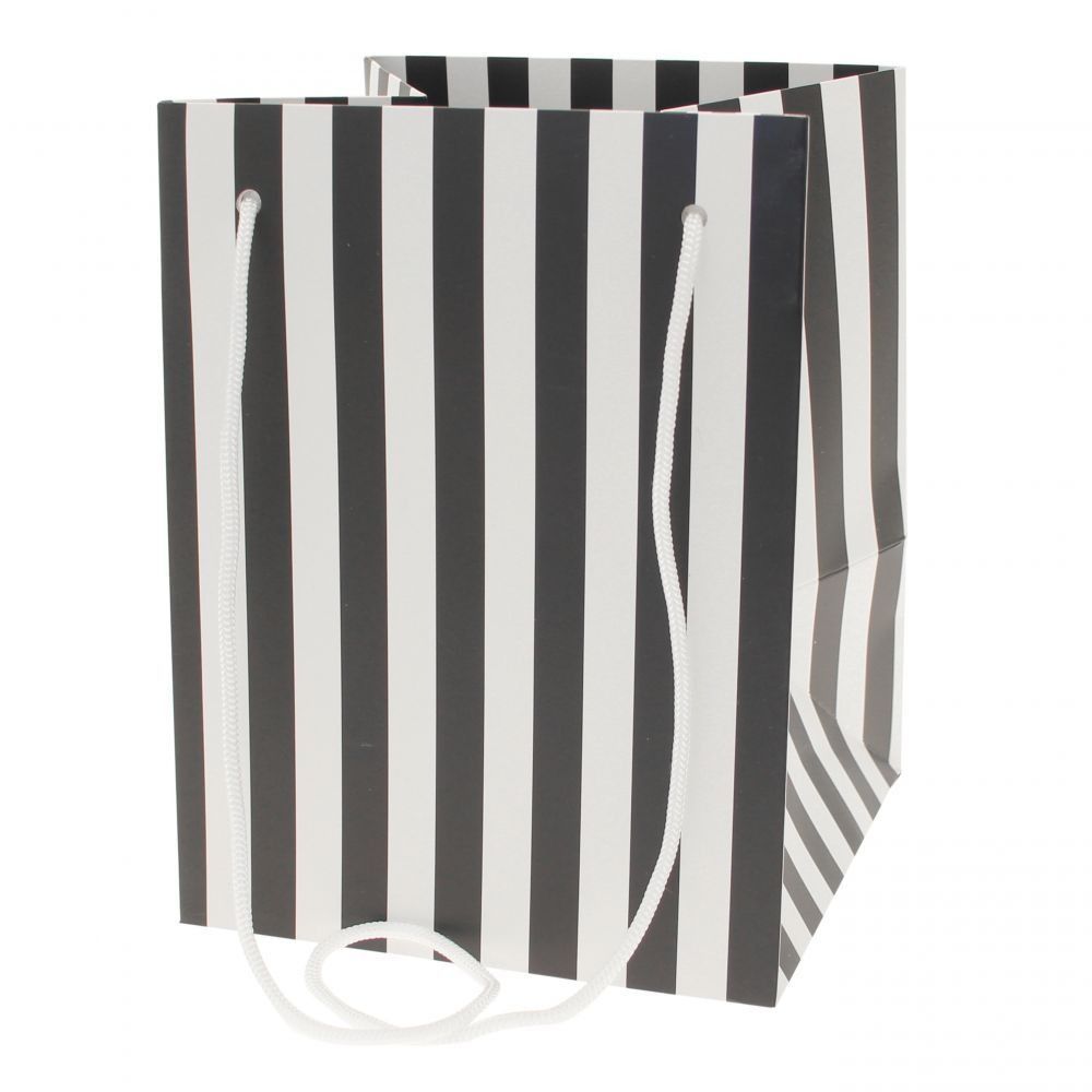 A black candy striped handtied gift bag with rope handles. Beautiful hand tied bags make the perfect gift holder for any occasion. Easy, efficient and reusable.