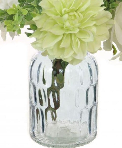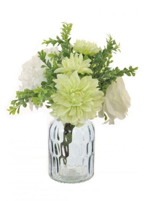 This vibrant artificial Blueboy Dahlia arrangement comes in a stylish glass vase. Its gorgeous colours and realistic flowers will bring beauty to your home for years to come. Thanks to its artificial material, you can enjoy this stunning arrangement without the hassle of watering or maintenance.