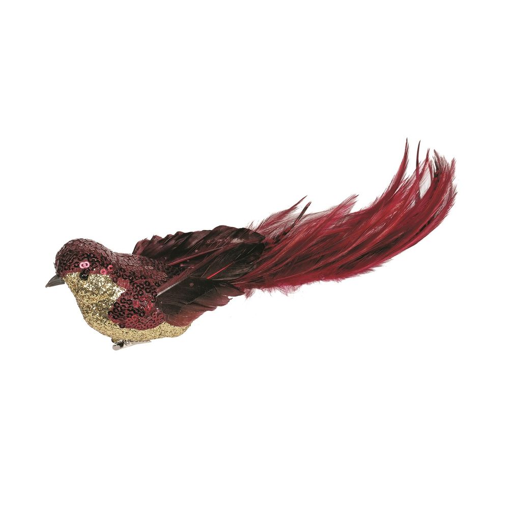 The bird is crafted from feathers and covered in luxurious, reflecting burgundy sequins, evoking a winter glimmer and bringing to mind visions of the sweetest snowflakes. Perfect for attaching to your desk or any other spot in your house that requires a festive boost, the clip securely fastens the bird directly. Make sure your Christmas celebration is even more enchanting with this one-of-a-kind Burgundy Sequin and Glitter Bird with Clip. Great for craft project too!