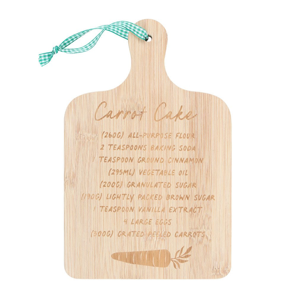Serve up a slice of freshly baked cake on this wooden serving board, complete with a carrot cake recipe for inspiration. A thoughtful gift for bakers or anyone who appreciates functional kitchen decor.