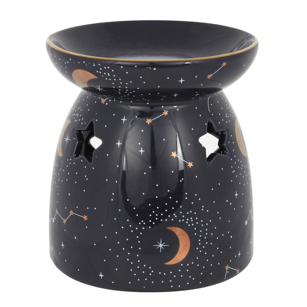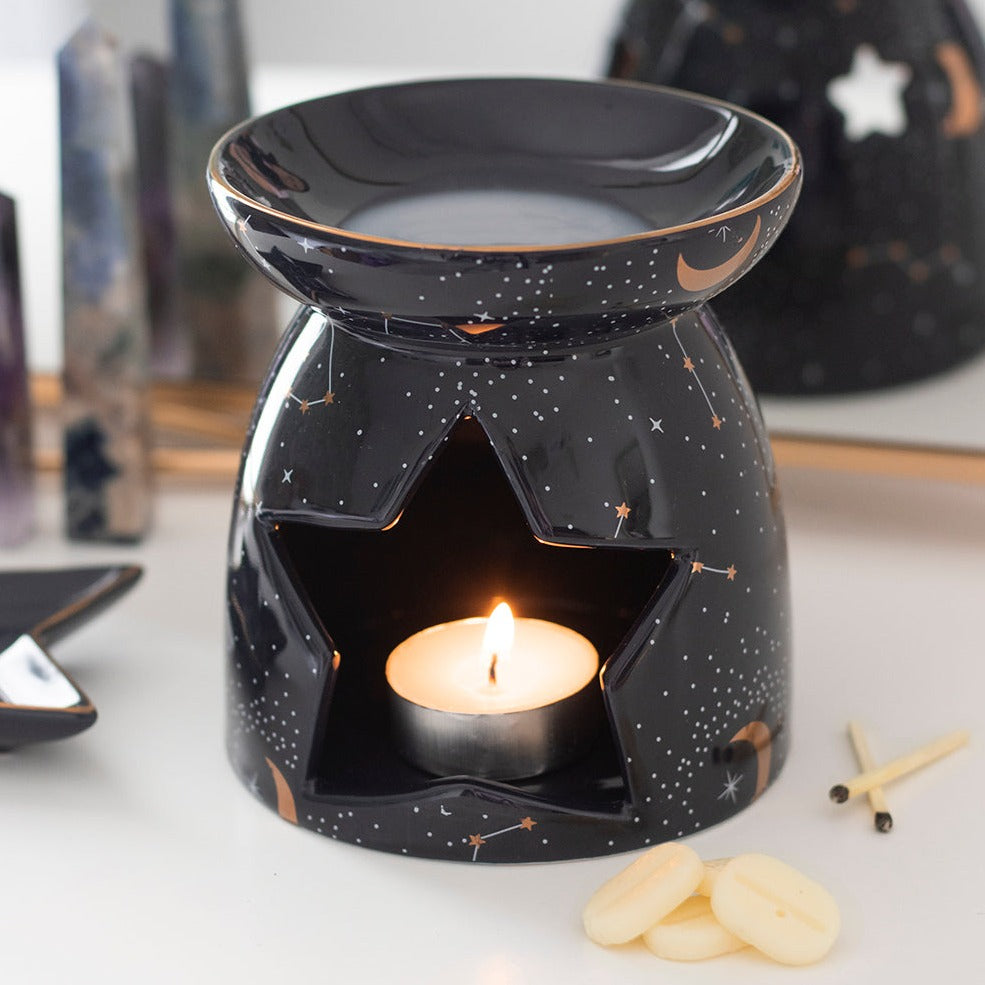 Purple oil burner featuring a contemporary, on-trend constellation design with metallic gold details. A star-shaped opening allows you to easily add in a tealight and the dish is suitable for fragrance oils and wax melts. Place fragrance oil or wax melts into the built-in dish with a standard tealight inside to fill the home with calming fragrance.