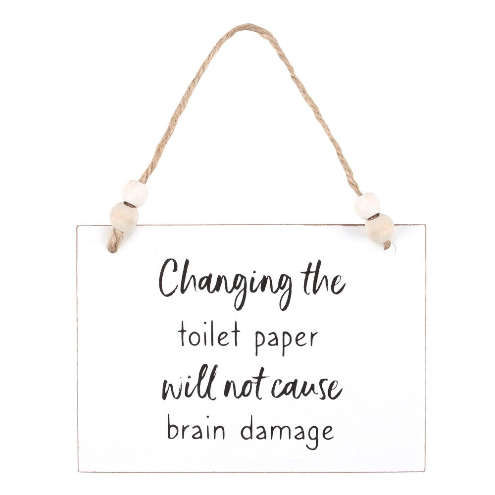 Features text that reads, 'Changing the toilet paper will not cause brain damage' and finished with four wooden beads.