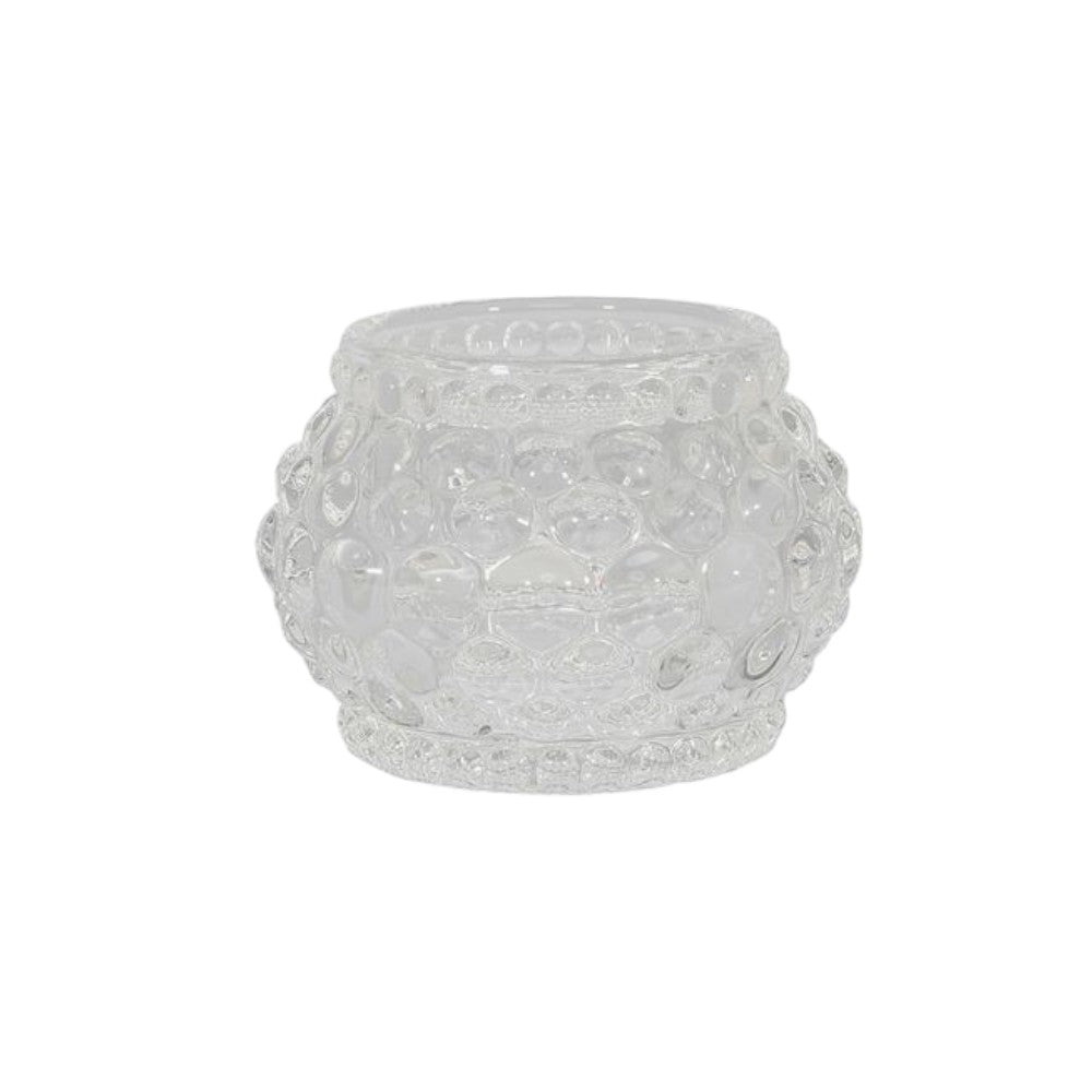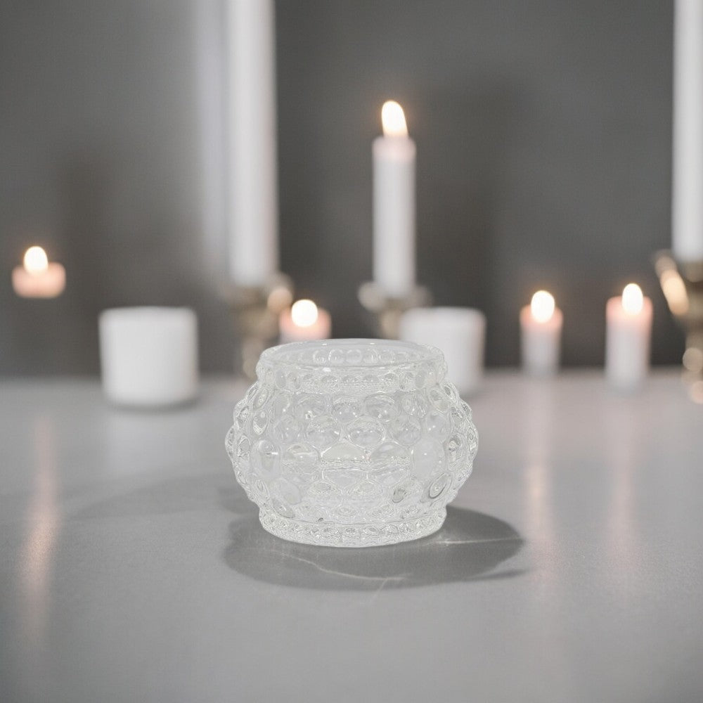 A charming addition to any home decor or event setting. Crafted with precision, this glass votive doubles as a tealight holder, perfect for creating a warm, inviting ambiance. With dimensions of H5cm x Dia. 7cm, it's versatile enough to serve as a small vase or a table centerpiece. Whether adorning your dining table, adding a touch of elegance to a wedding reception, or enhancing the ambiance of any space, this Votive promises to elevate your decor with its timeless beauty.