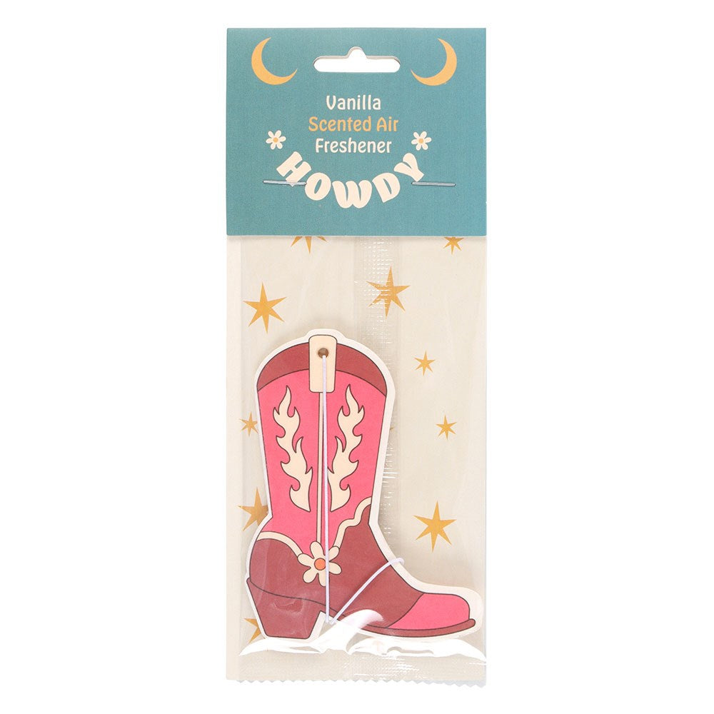 Add a dash of western charm to your journey with this cowboy boot air freshener. Featuring a warm, smooth vanilla scent, this air freshener is perfect for those who like a retro aesthetic and sweet aromas. Great for small places in the home.
