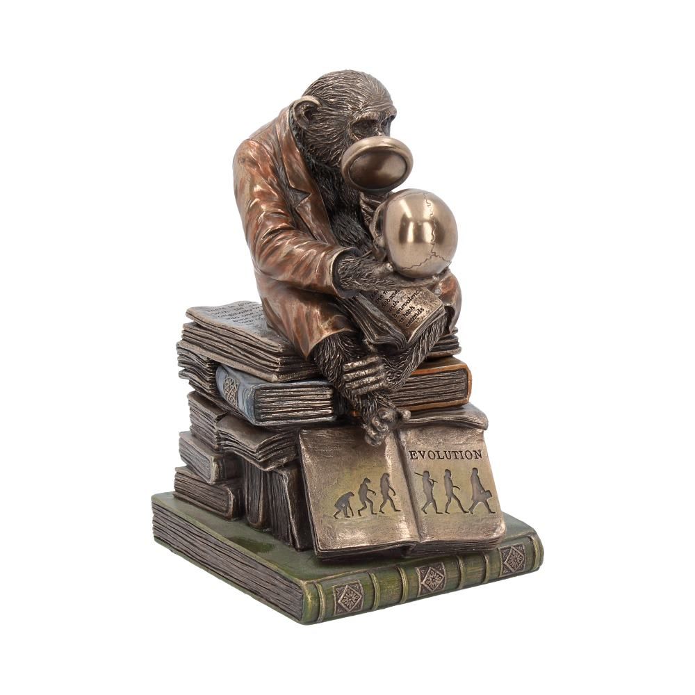 From alternative brand Nemesis Now, this thought provoking figure is cast in top quality resin before being lovingly finished in Bronze. Sitting on a pile of aged books, this personified chimpanzee studies a human skull. He wears a blazer jacket and uses a magnifying glass to clearly see his subject. Beneath his feet, Darwin's Theory of Evolution lays open showing a page outlining the evolution of man. Clearly the chimp sees that he's not so different from ourselves.