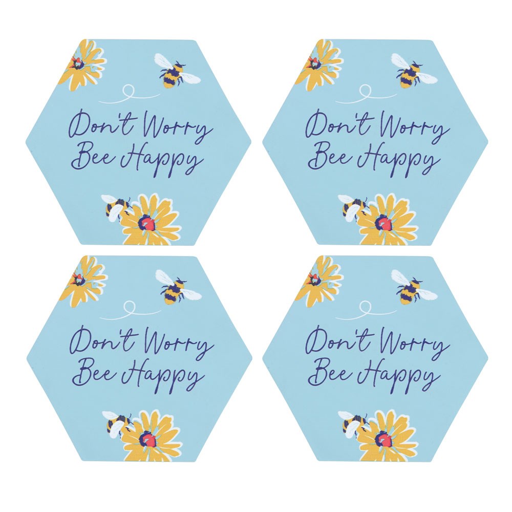 Brighten your space with this set of coasters, featuring a cheerful bee and flower design and 'Don't Worry Bee Happy' text. Great for keeping surfaces clean.