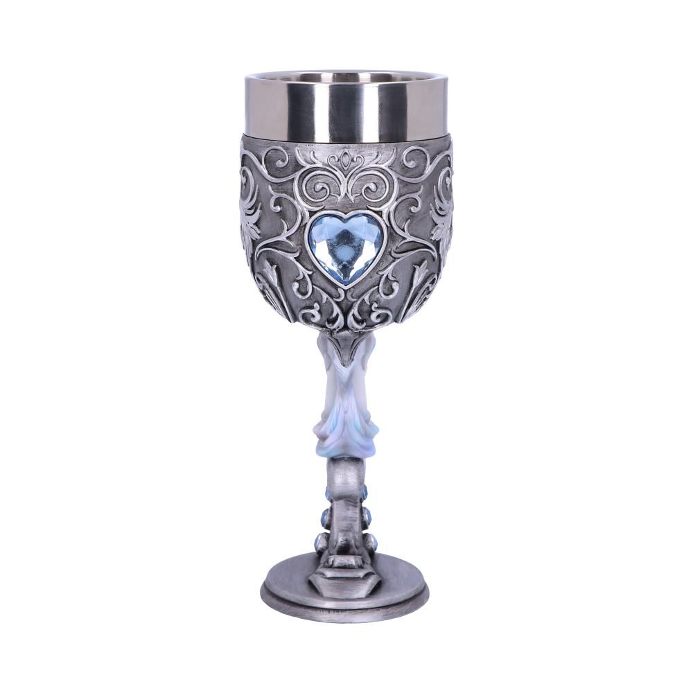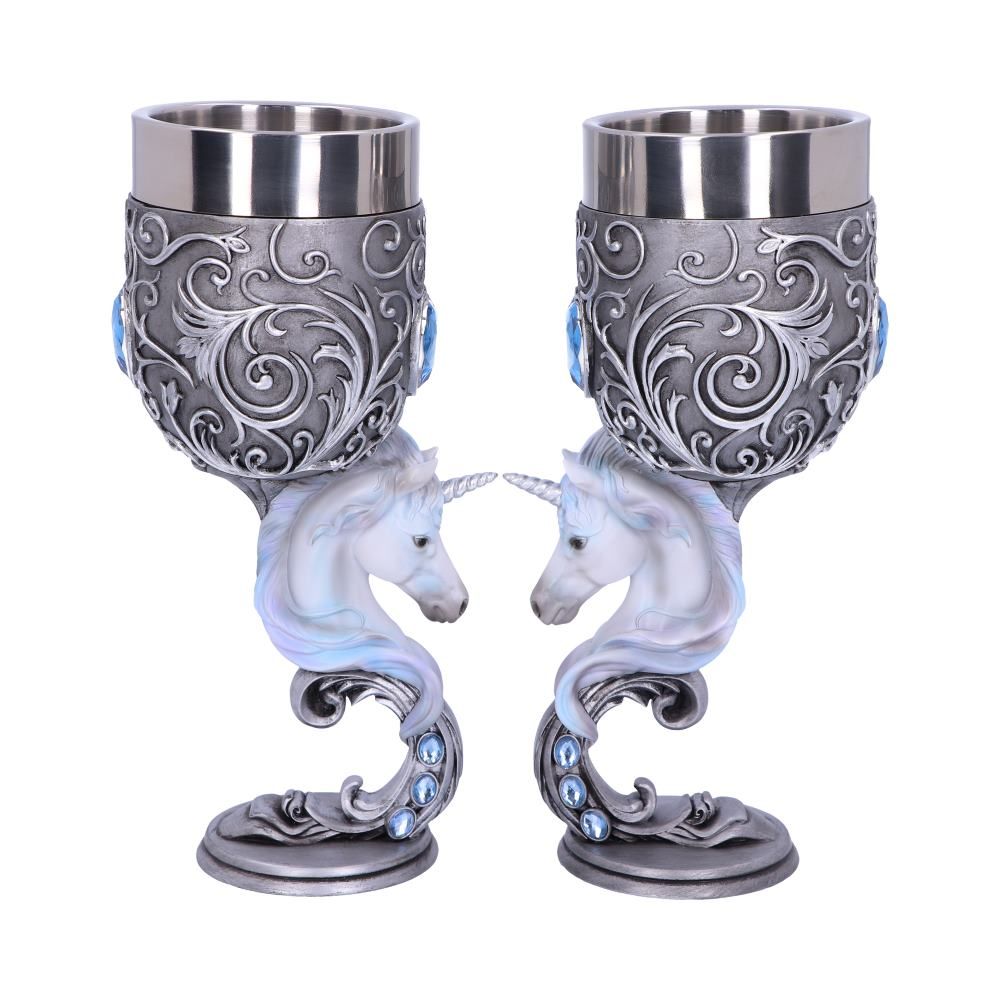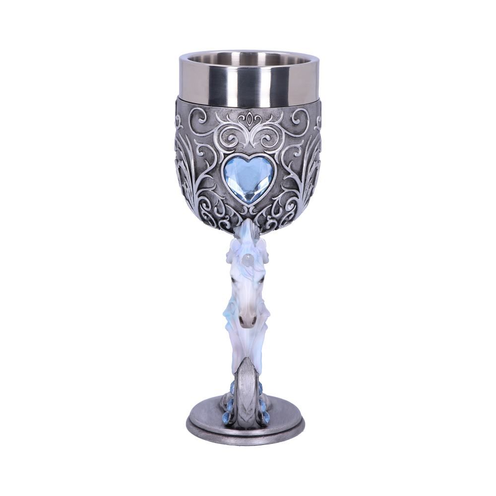 When I look into your eyes, I see the promise of love' Adorned with intricate silver baroque detailing rising from the metallic base to the stainless-steel rim, this goblet is the perfect addition to any Fantasy collection. At the centre of the carefully sculpted stem is the head of a white Unicorn protruding outwards. Above it is an icy blue gemstone crafted into a traditional heart shape. Cast in high-quality resin and carefully hand-painted these Enchanted Hearts goblets can be paired together to form the shape of a heart, perfect for sharing with your mystic love.