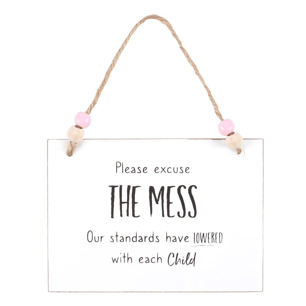 A light-hearted hanging sign perfect for any fun occasion. Features text that reads, 'Please excuse the mess, our standards have lowered with each child' and finished with four wooden beads.