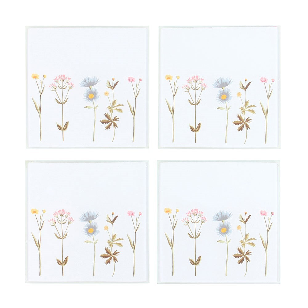 This sweet and understated set of glass coasters includes 4 matching designs featuring a dainty floral design. Perfect for adorning a tabletop for spring entertaining and Mother's Day brunch.