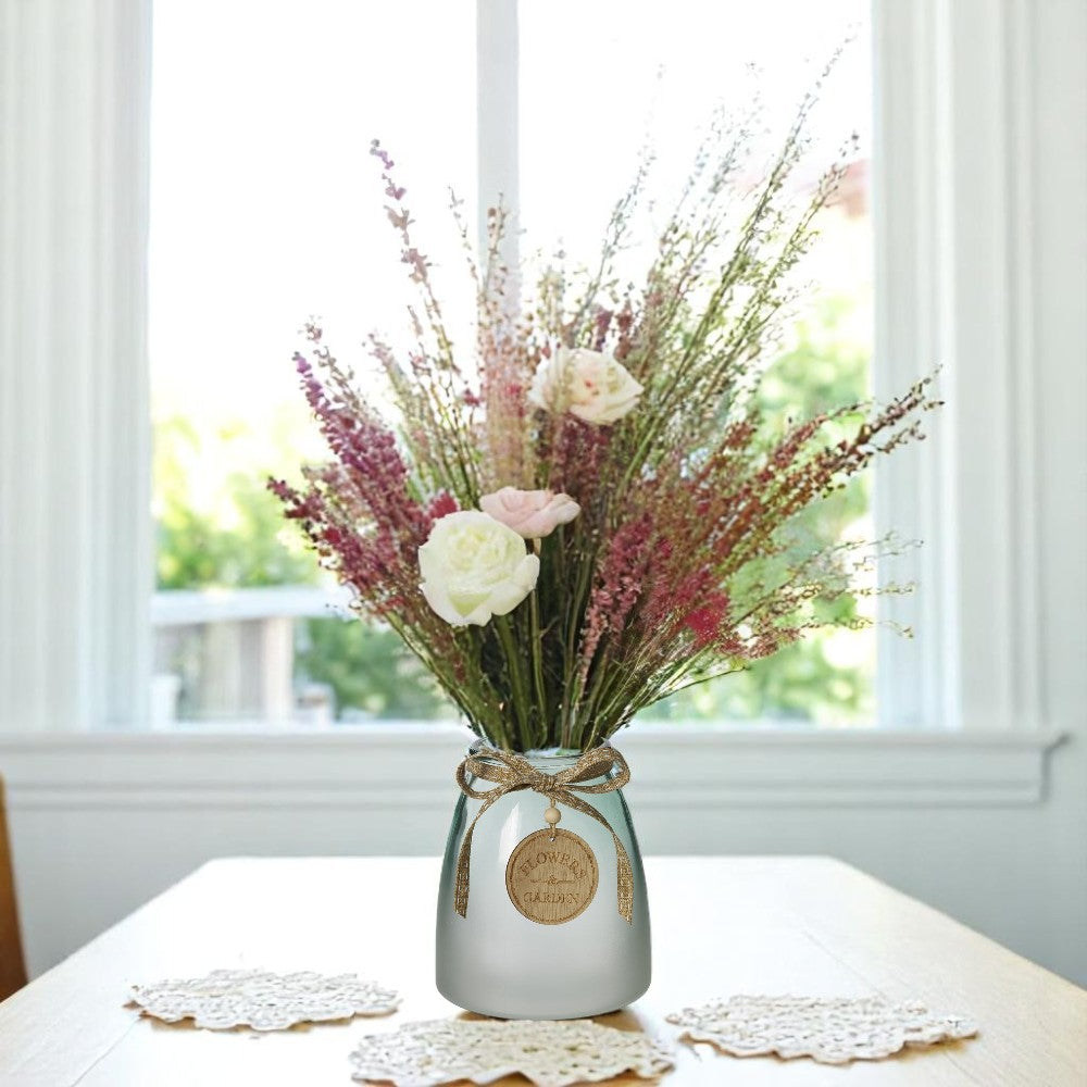 Bring a touch of gentle, garden-inspired charm into your home with this delightful frosted green glass jar vase. The soft, verdant hue of the glass, combined with its beautifully frosted finish, creates a dreamy, diffused light that will wonderfully showcase your favourite fresh or dried blooms. Its classic jar shape offers versatile style, perfect for holding everything from a hand-picked posy from your garden to a more structured bouquet or even single elegant stems. Adding a uniquely rustic and thoughtful touch is the sweet wooden tag, carefully engraved with the heartwarming text "flowers & garden." This lovely detail enhances its cottage-chic appeal