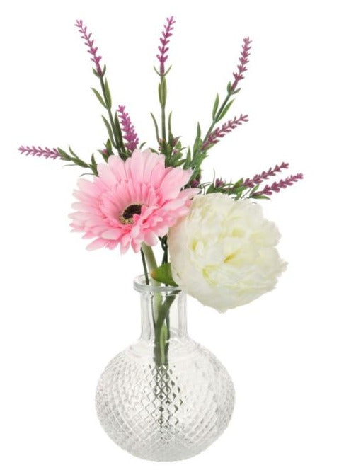 Add vibrant colors to your home with this beautiful artificial floral arrangement. The Gerbera & Peony in a Ball Vase includes a realistic peony and gerbera in a vase with lavender stems and foliage for a unique, eye-catching design. It's a perfect way to add a touch of natural beauty to any room.