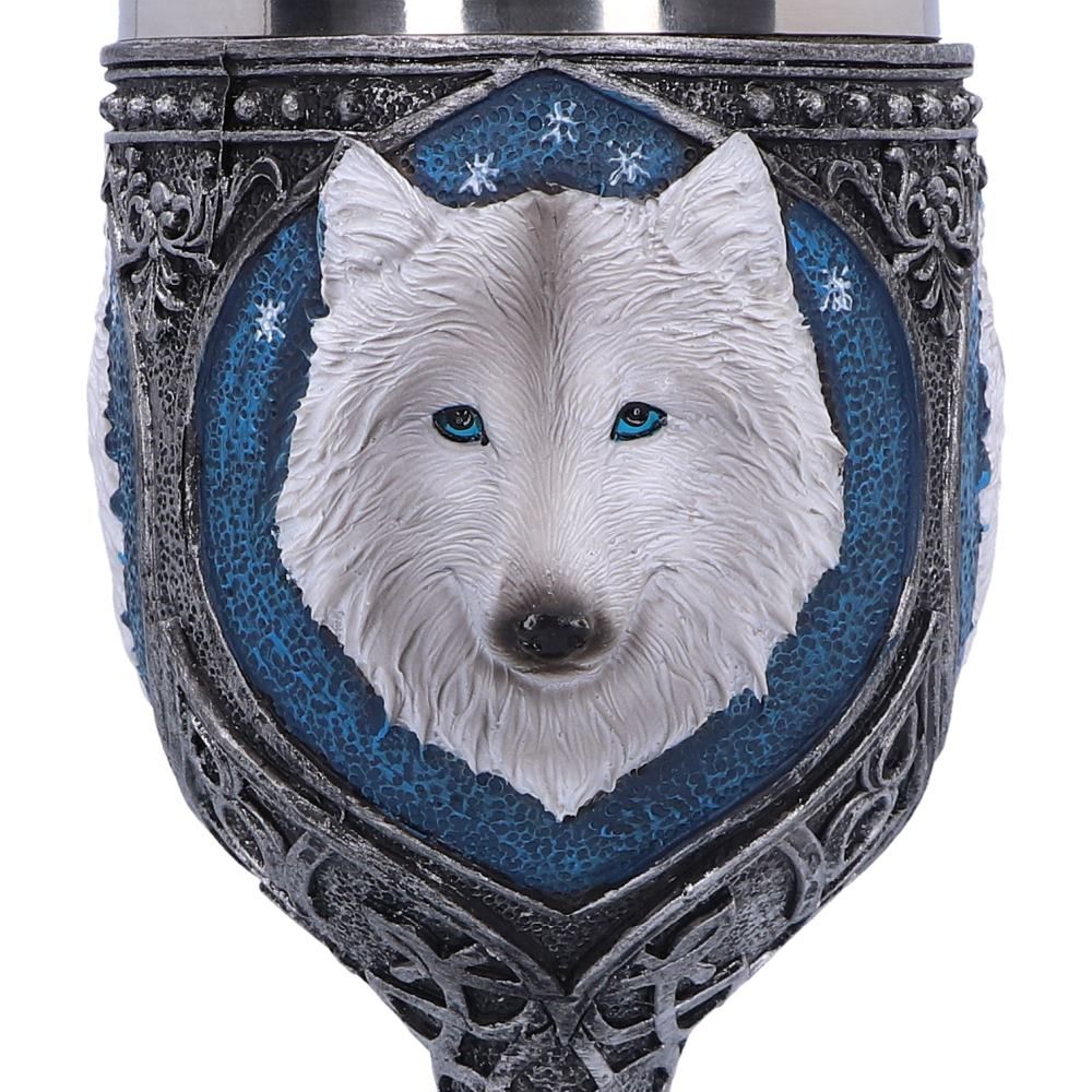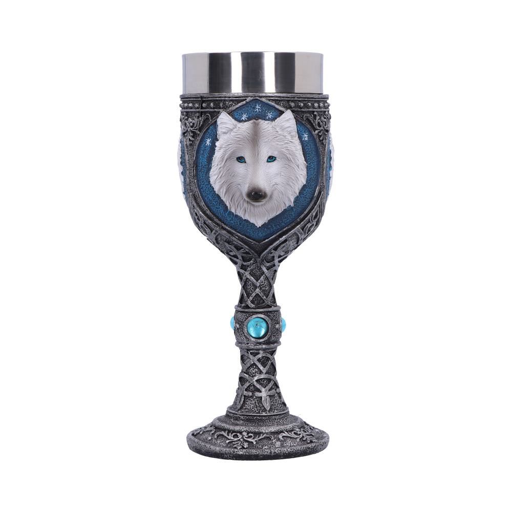 This Fantasy wolf goblet is cast in the finest resin before being lovingly hand-painted. The body of this piece is silver and covered in repeating Celtic knot patterns. The pattern is interrupted on the sides by a large blue oval, in the centre of which is a large white wolf's head, staring out with red eyes and preternatural wisdom. With a removable stainless steel insert for ease of cleaning, this chalice is perfect for those who feel the call of the wild with every swig.