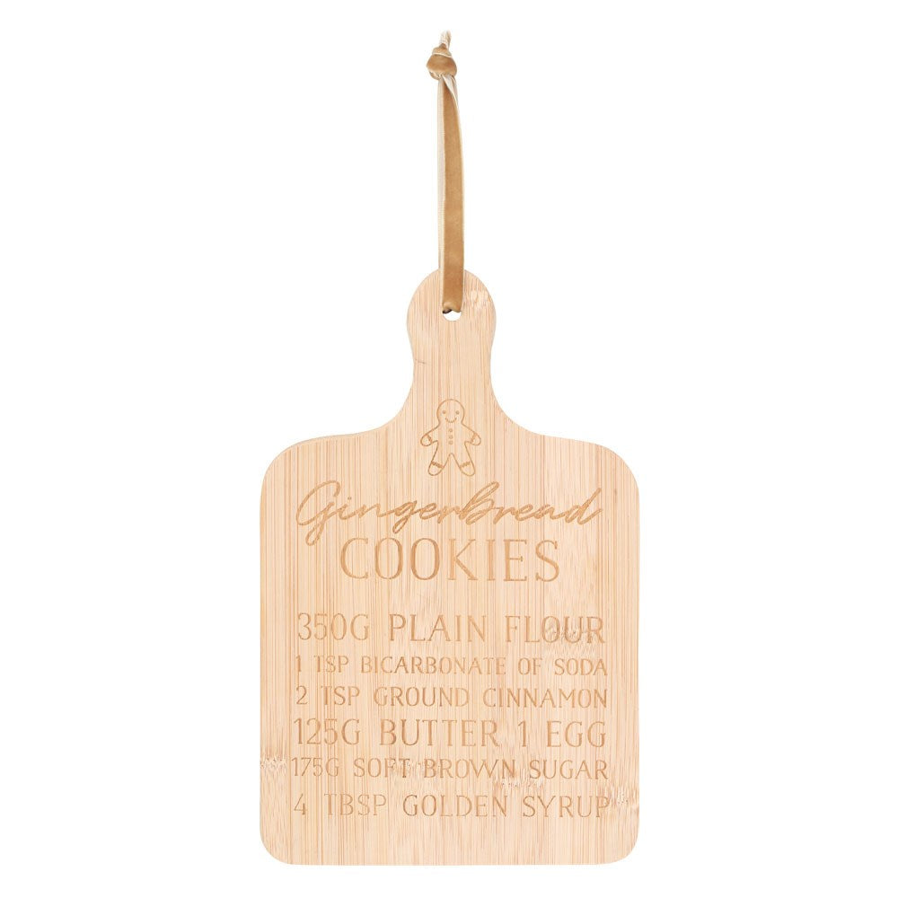 Prepare and serve Christmas cookies in festive style with this charming bamboo serving board. Features 'Gingerbread Cookies' text followed with a simple list of ingredients for making a classic Christmas treat. Finished with a velvet ribbon for easy hanging and display. Food safe. Hand wash only. Do not soak.