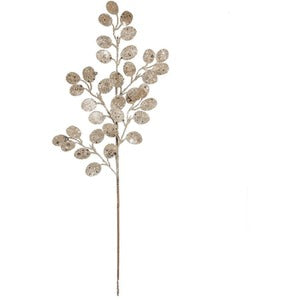 Add some sparkle to your displays with this Champagne Glitter Eucalyptus Artificial Stem. This stem is crafted with glitter for a touch of glam and is made to last forever. Perfect for adding a bit of shine to any arrangement or decor.