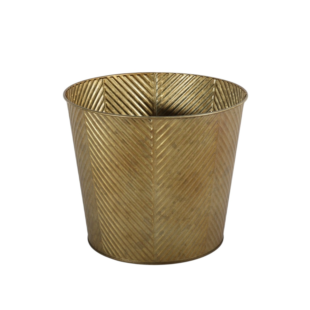 Add a touch of vintage glamour and sophisticated charm to your plants with this stunning Gold Wash Zinc Planter! This beautifully crafted planter is made from durable zinc and features an eye-catching embossed chevron pattern all brought to life with an elegant gold wash finish. The warm, metallic sheen provides a luxurious yet subtly rustic appeal, making it a versatile addition to both contemporary and traditional decor styles. This planter is perfect for showcasing your favourite medium-sized houseplants, herbs, or creating beautiful floral arrangements. Its robust construction makes it suitable for both indoor and outdoor use, allowing you to bring a touch of golden elegance to your living room, patio, balcony, or garden space. Plant not included.