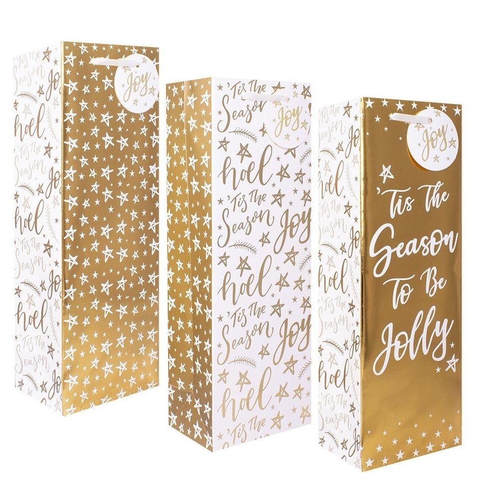 Place your special gifts in a delightful gold bottle bag with a decorative Christmas design. Perfect for creating festive cheer when gift giving this Christmas.