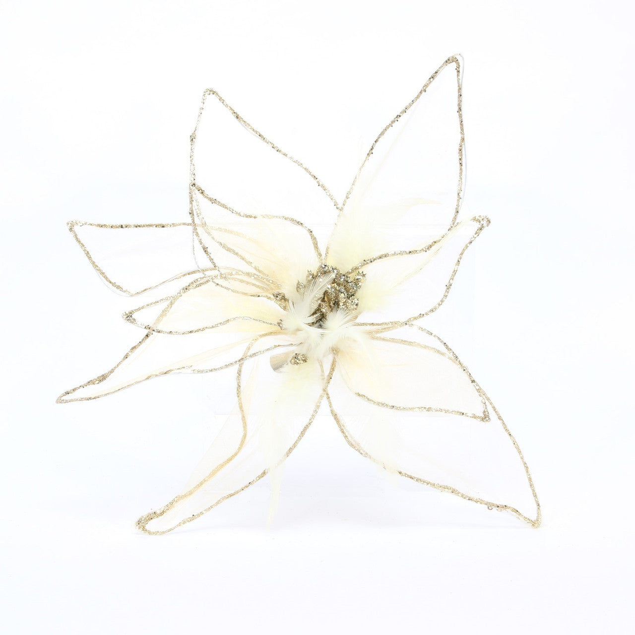 This stunning gold poinsettia is adorned with enchanting glitter and organza material, making it a stand-out addition to your Christmas decor. The convenient clip allows you to effortlessly attach it to wreaths, garlands, centrepieces, or any creative display. With its vivid hue and shimmering charm, this glittered organza gold poinsettia transforms your space into a winter wonderland.