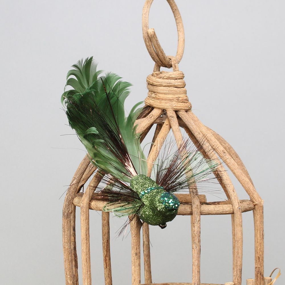 Add a touch of glamour to your crafts or decorations with this beautiful green Fantasy bird. Crafted with a lovely feather tail, glitter and a clip, this stunning accessory is perfect for adding a special touch to any project. Enjoy a professional-looking result with this high-quality decoration. Perfect for attaching to Christmas trees.