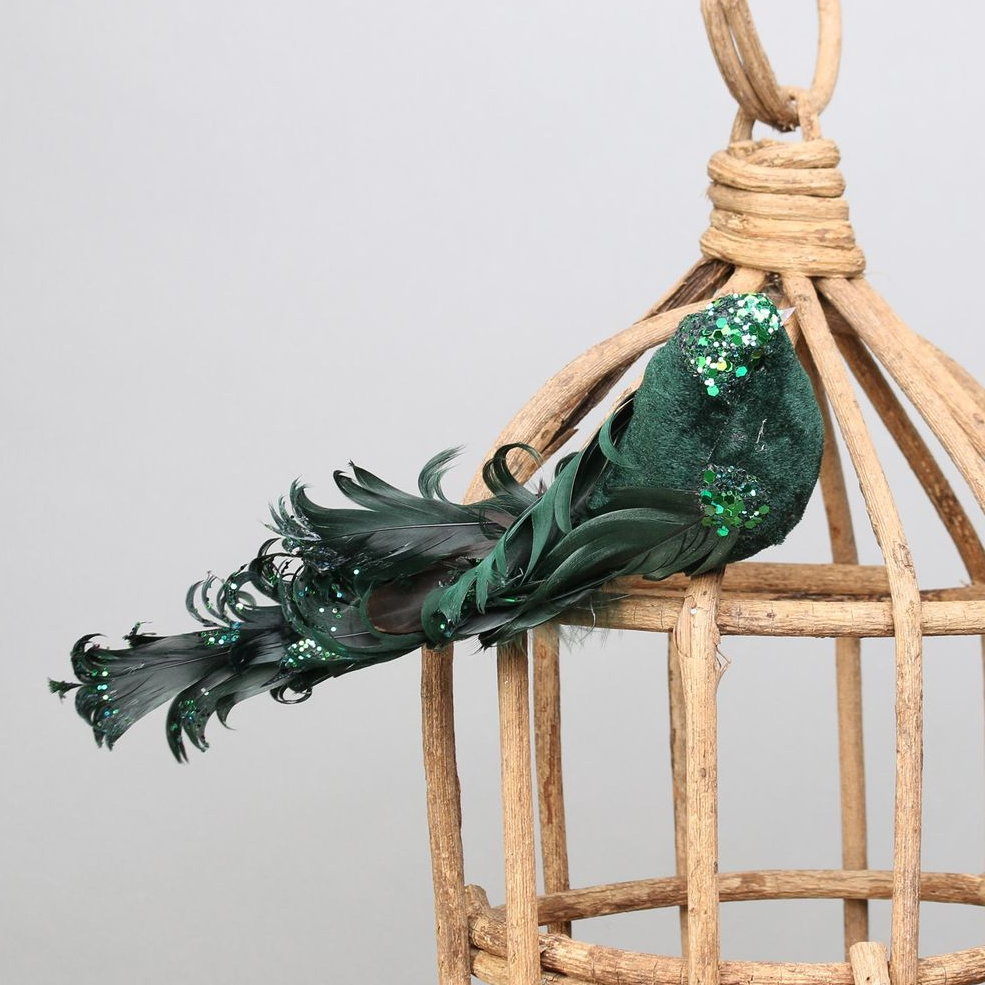 This Decorative Green Show Feather Bird with clip is the perfect extra touch for your holiday décor. Crafted with a glitter head and velour body, it adds a charming look with its plume of tail feathers. Easily clip it to any branch for a memorable holiday scene.