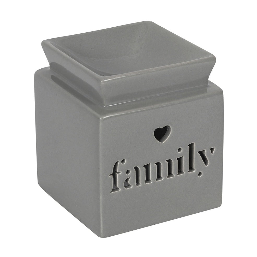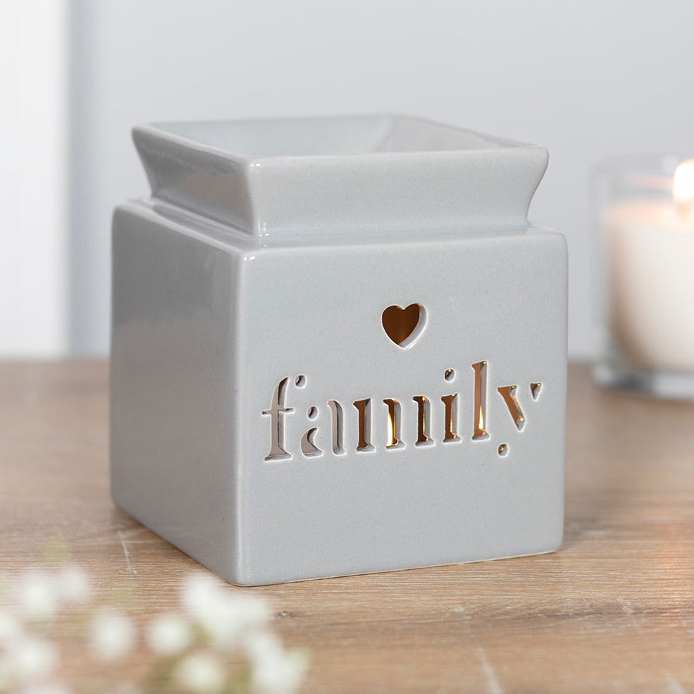 Light grey ceramic oil burner features a cut out heart and 'family' text in a cute, contemporary design. Place fragrance oil or wax melts into the built-in dish with a standard tealight inside to fill the home with calming fragrance.