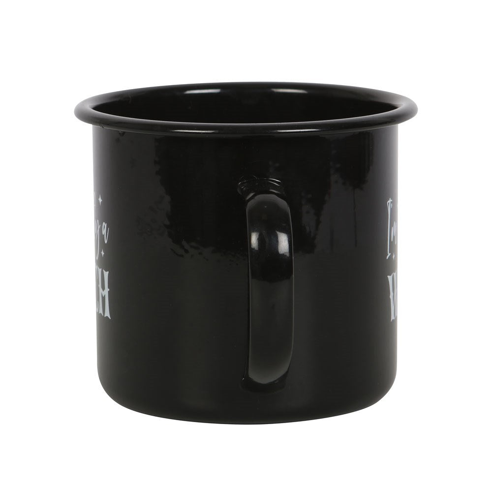 Quench your thirst like a witch with this enamel-style mug! Featuring 'I'm secretly a witch' text on a black base, it's perfect for all your spooky brews, hot or cold. Stay hydrated while casting spells and making potions.