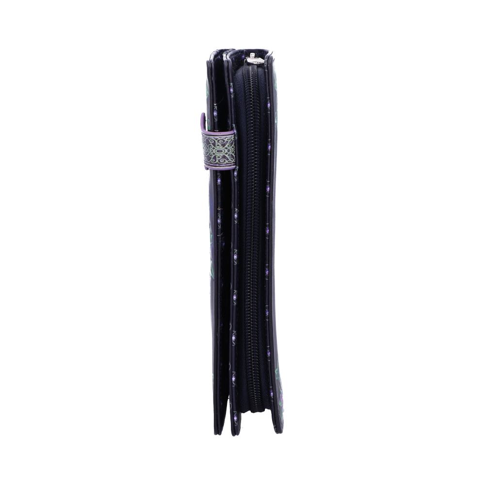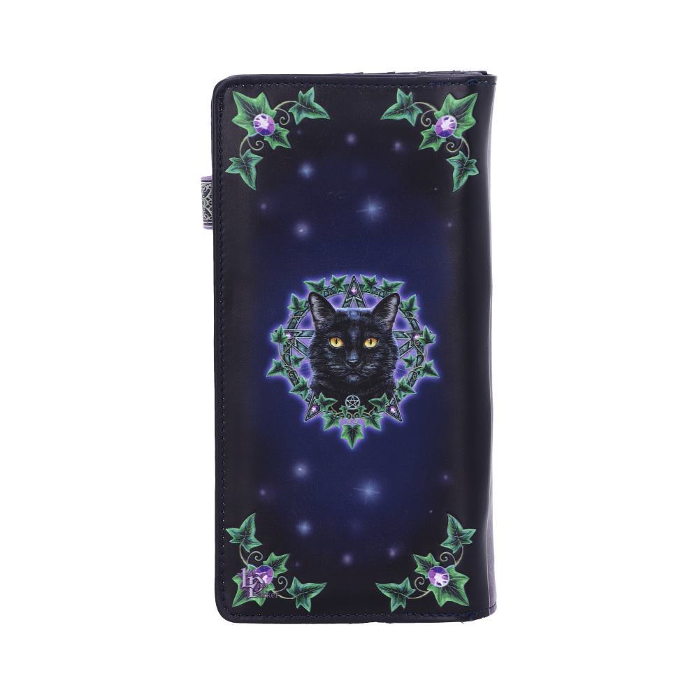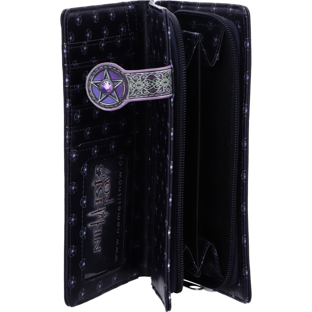 From the untamed imagination of Lisa Parker, this embossed purse has been bought to life by alternative masters Nemesis Now. A cat's head stares directly at you, hard yellow eyes portraying a soul touched by Witchcraft. The points of a pentagram can be seen from behind, with large networks of Ivy clinging to the frame. The background around the design fades from black on the edges to a deep purple, around the portrait. The beautiful embossed detailing enhances the magic and creates a striking 3D effect.