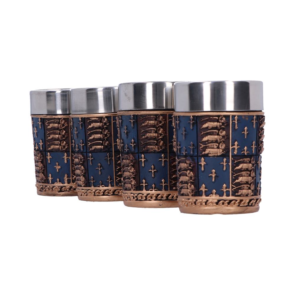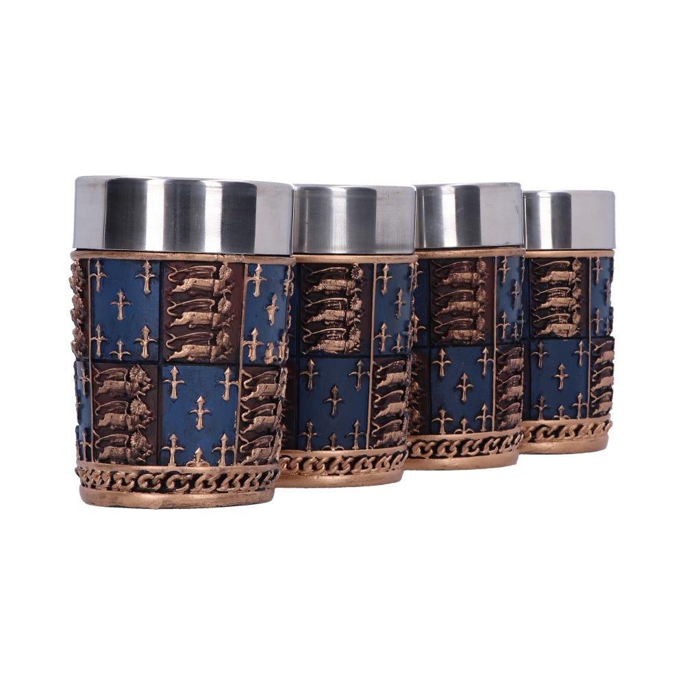 Show your noble roots with these fantastic Medieval shot glasses, created by alternative brand Nemesis Now. This shot glass bears a coat of arms type design, similar to the royal standard of Henry IV. Cast in the finest resin before being carefully hand-painted, these shot glasses are ideal to show your royal blood at any gathering.