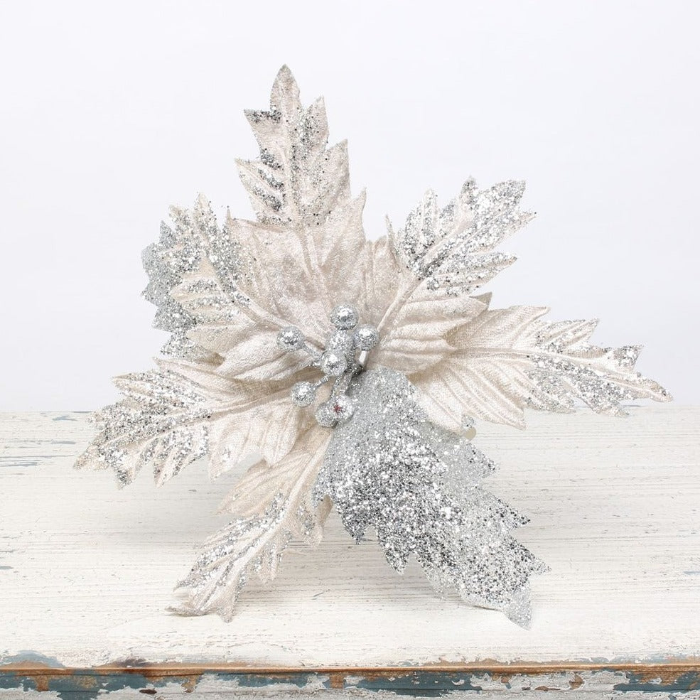 Artificial Medium Silver Poinsettia Pick