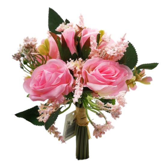 Add a touch of colour and beauty to your home with this mini rose and rosebud bundle with foliage pink Bouquet. This vibrant bunch of artificial flowers is perfect for weddings, decorating, gifting, or simply brightening up your space. With a height of 22cm, easily place them in a vase for an instant pop of cheerfulness into your home or a perfect size for a handheld bouquet.