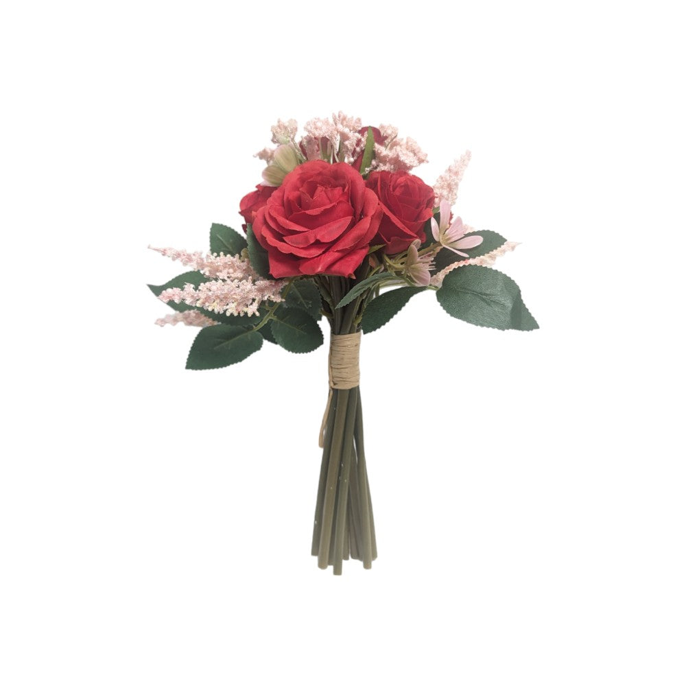 Add a touch of colour and beauty to your home with this mini rose and rosebud bundle with foliage red Bouquet. This vibrant bunch of artificial flowers is perfect for weddings, decorating, gifting, or simply brightening up your space. With a height of 22cm, easily place them in a vase for an instant pop of cheerfulness into your home or a perfect size for a handheld bouquet.