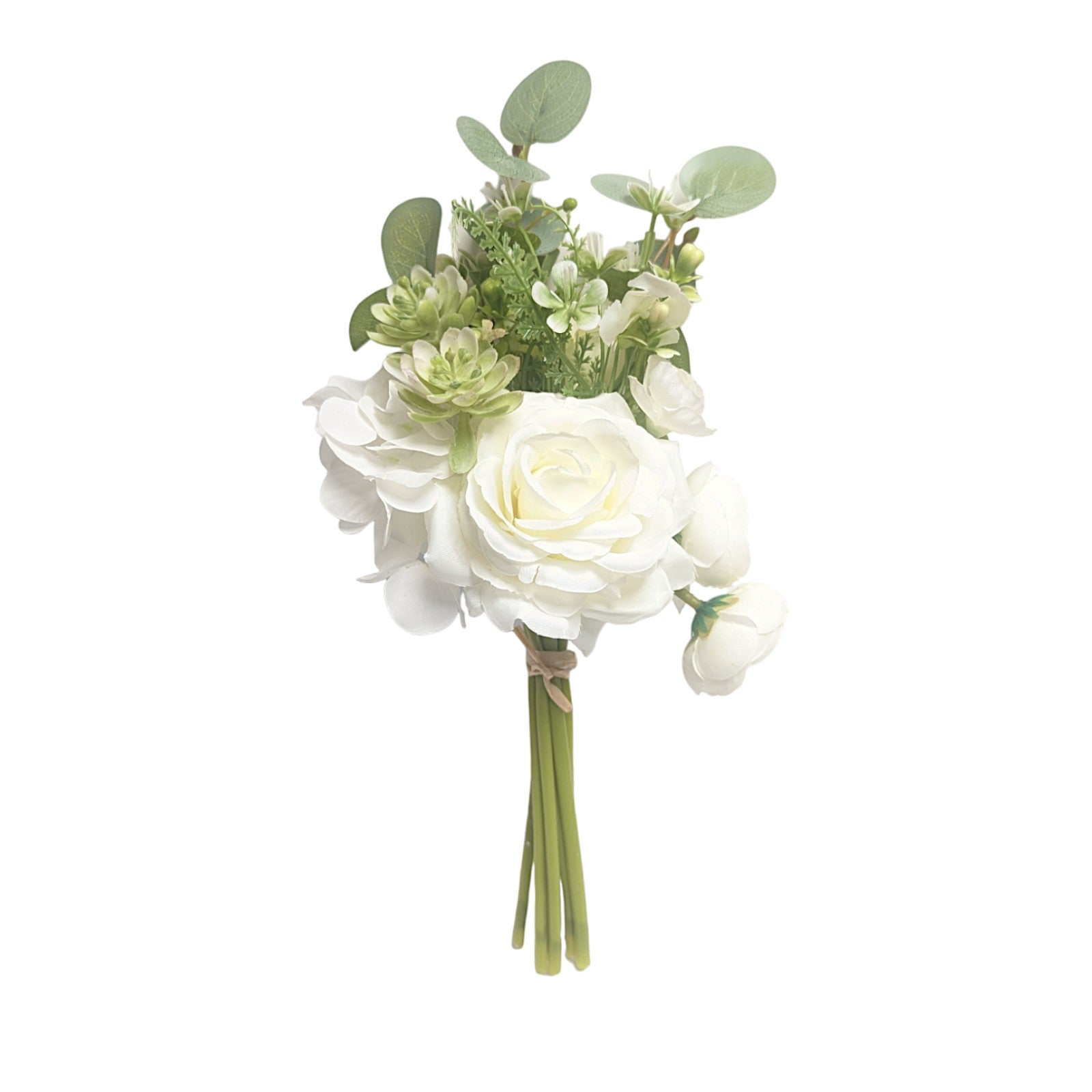 Add a touch of colour and beauty to your home with this mixed ivory rose bouquet with foliage. This vibrant bunch of artificial flowers is perfect for weddings, decorating, gifting, or simply brightening up your space. With a height of 27cm, easily place them in a vase for an instant pop of cheerfulness into your home or a perfect size for a handheld bouquet.