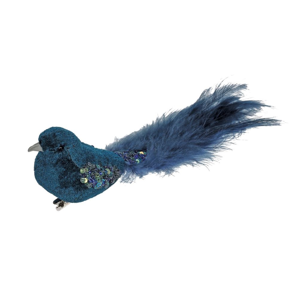Sparkle in the Christmas season with this Peacock Blue Velvet Bird with Glitter and Clip. Easy to hang on a tree with the attached clip. Great for using as a craft project or just clip anywhere in the home as a decorative piece.