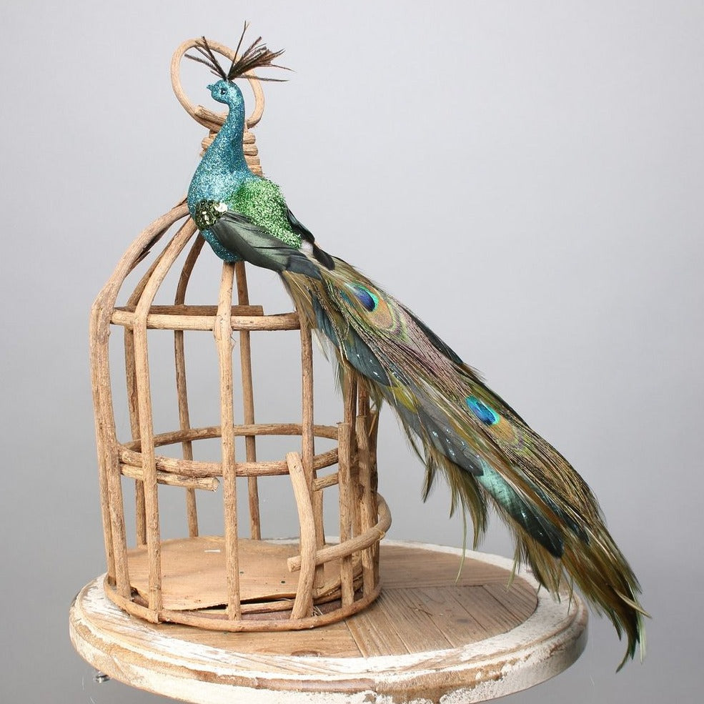 Add a touch of glamour to your crafts or decorations with this beautiful Blue and Green longtail Peacock Bird. Crafted with feathers, glitter and a clip, this stunning accessory is perfect for adding a special touch to any project. Enjoy a professional-looking result with this high-quality decoration. Perfect for attaching to Christmas trees.