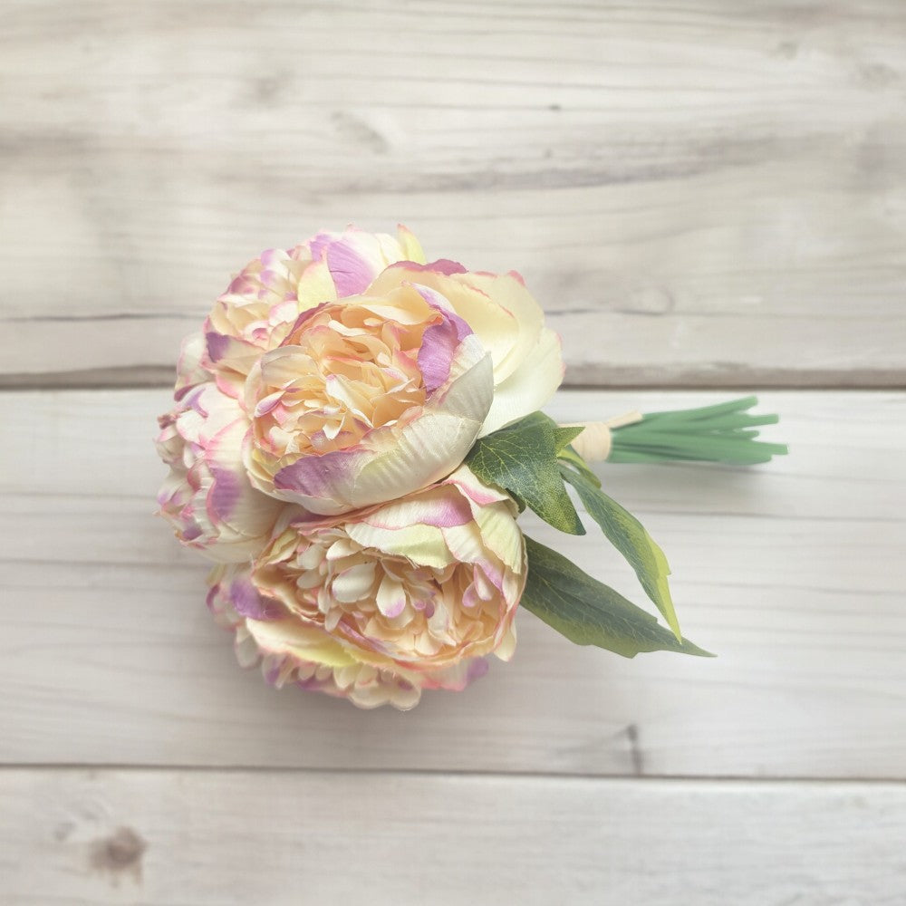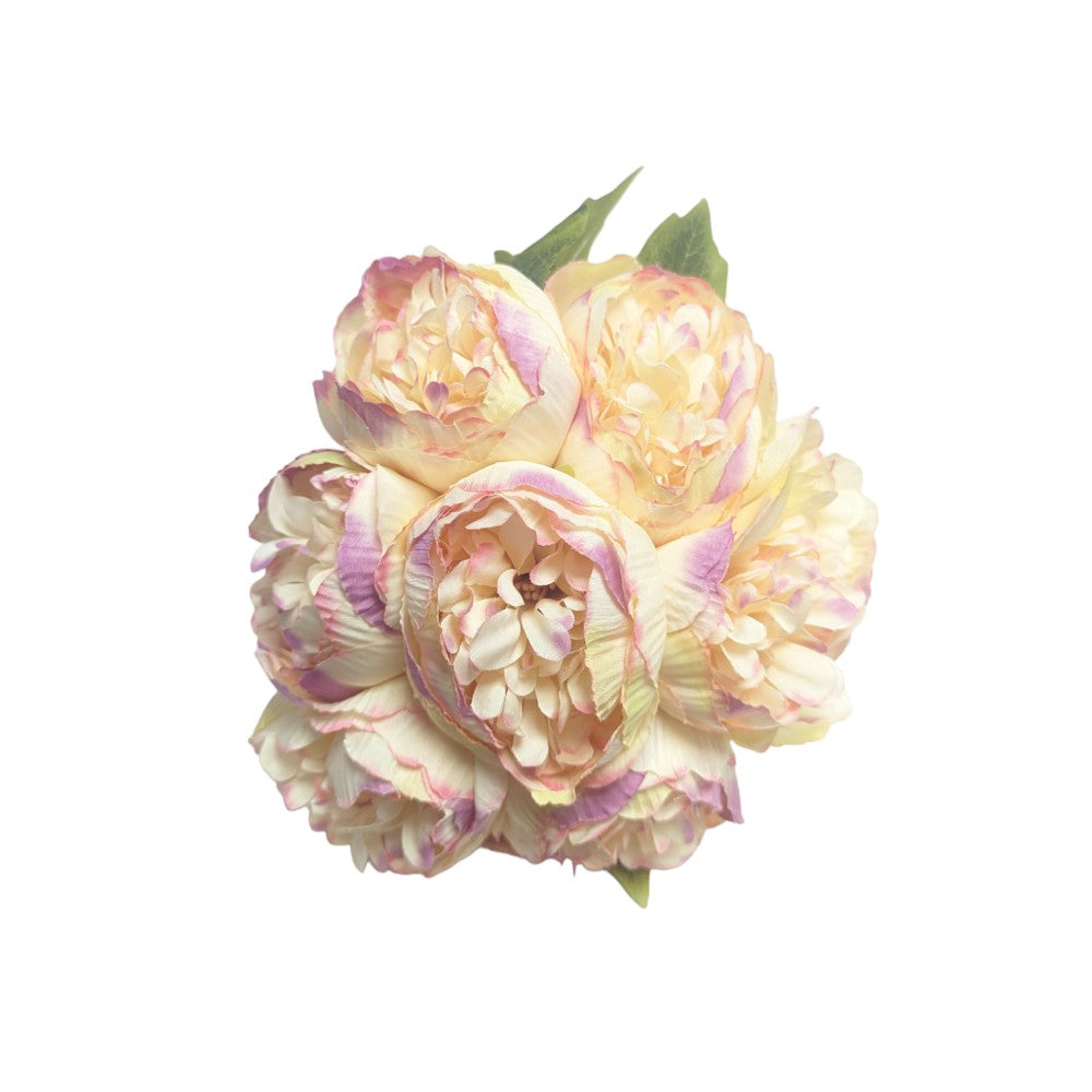 Bring the lush, summer splendor of a peony garden directly to your home with this exquisite Peach/ Pink Peony Bouquet. Artfully crafted with delicate petals in a fully open style and realistically textured foliage, this bouquet is delicately bound with string for a beautiful yet practical display. An ideal accompaniment for any vase or for creating your own unique floral arrangements, this bouquet brings the natural elegance and joy of early summer to your home.