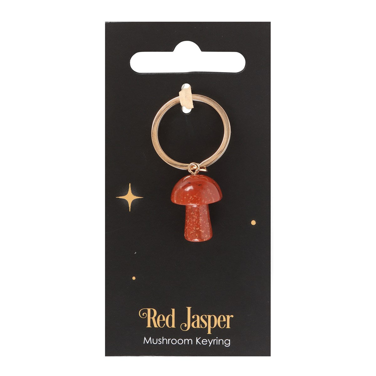 Harness the power of crystal healing with this mushroom gemstone keyring crafted from polished red jasper. The keyring features a mushroom-shaped gemstone attached to a gold keyring with a matching informational tag. Red Jasper is a powerful stone that promotes wellbeing and relaxation, radiating soothing energy that brings harmony and balance to your surroundings. Due to its nature, stone may vary in size, shape and colour.