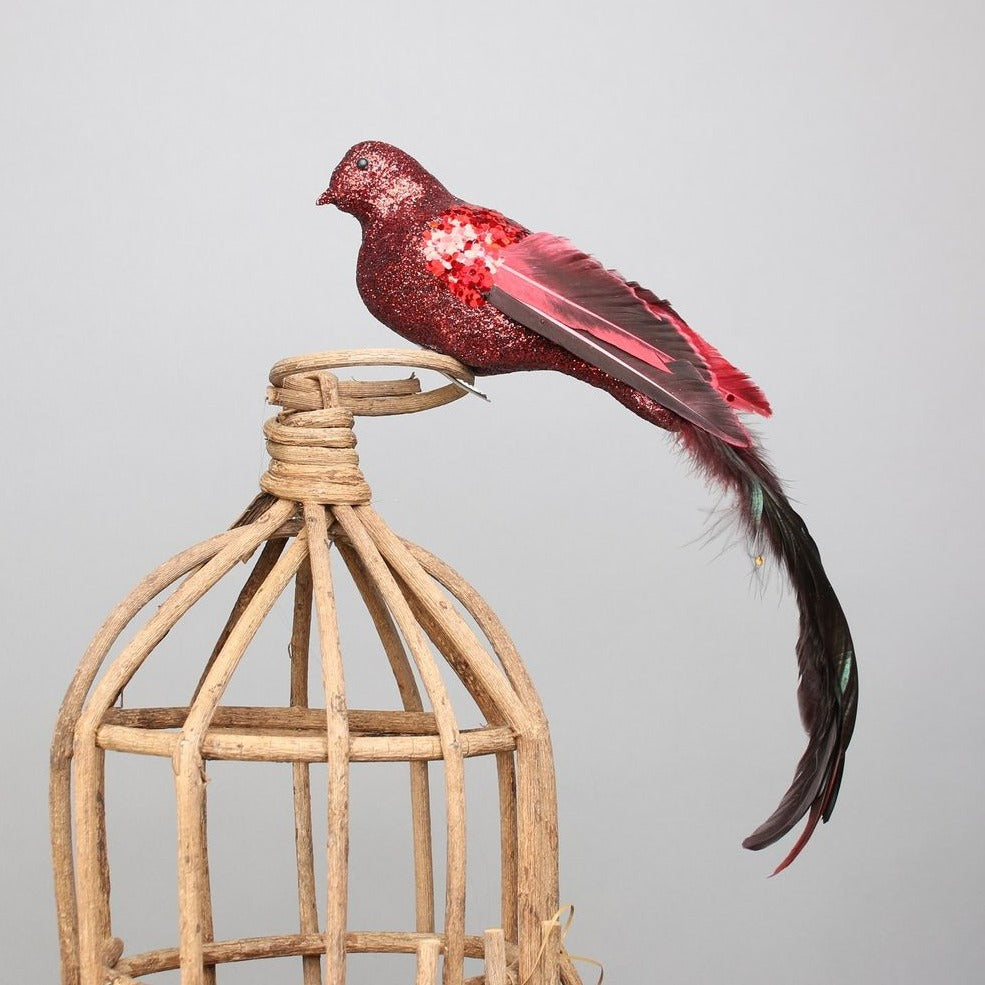 Add a touch of glamour to your crafts or decorations with this beautiful Red Paradise bird. Crafted with a lovely feather tail, glitter and a clip, this stunning accessory is perfect for adding a special touch to any project. Enjoy a professional-looking result with this high-quality decoration. Perfect for attaching to Christmas trees.