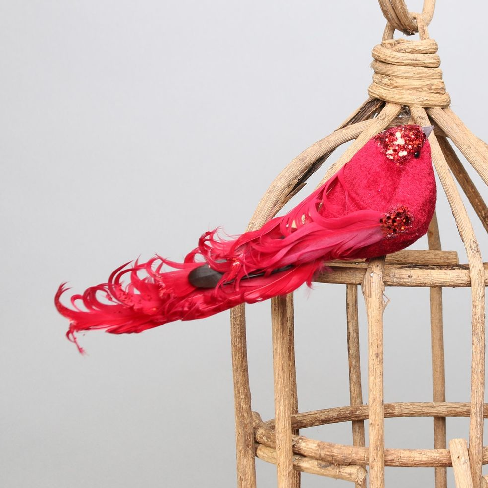 This Decorative Red Show Feather Bird with clip is the perfect extra touch for your Christmas décor. Crafted with a glitter head and velour body, it adds a charming look with its plume of tail feathers. Easily clip it to any branch for a memorable Christmas scene.
