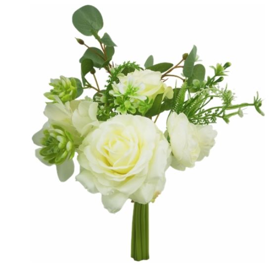 Add a touch of colour and beauty to your home with this mixed ivory rose and eucalyptus bouquet with foliage. This vibrant bunch of artificial flowers is perfect for weddings, decorating, gifting, or simply brightening up your space. With a height of 27cm, easily place them in a vase for an instant pop of cheerfulness into your home or a perfect size for a handheld bouquet.
