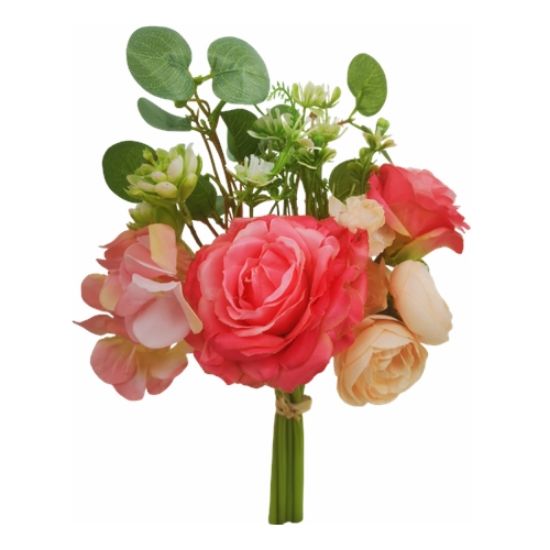 Add a touch of colour and beauty to your home with this mixed pink and cream rose and eucalyptus bouquet with foliage. This vibrant bunch of artificial flowers is perfect for weddings, decorating, gifting, or simply brightening up your space. With a height of 27cm, easily place them in a vase for an instant pop of cheerfulness into your home or a perfect size for a handheld bouquet.